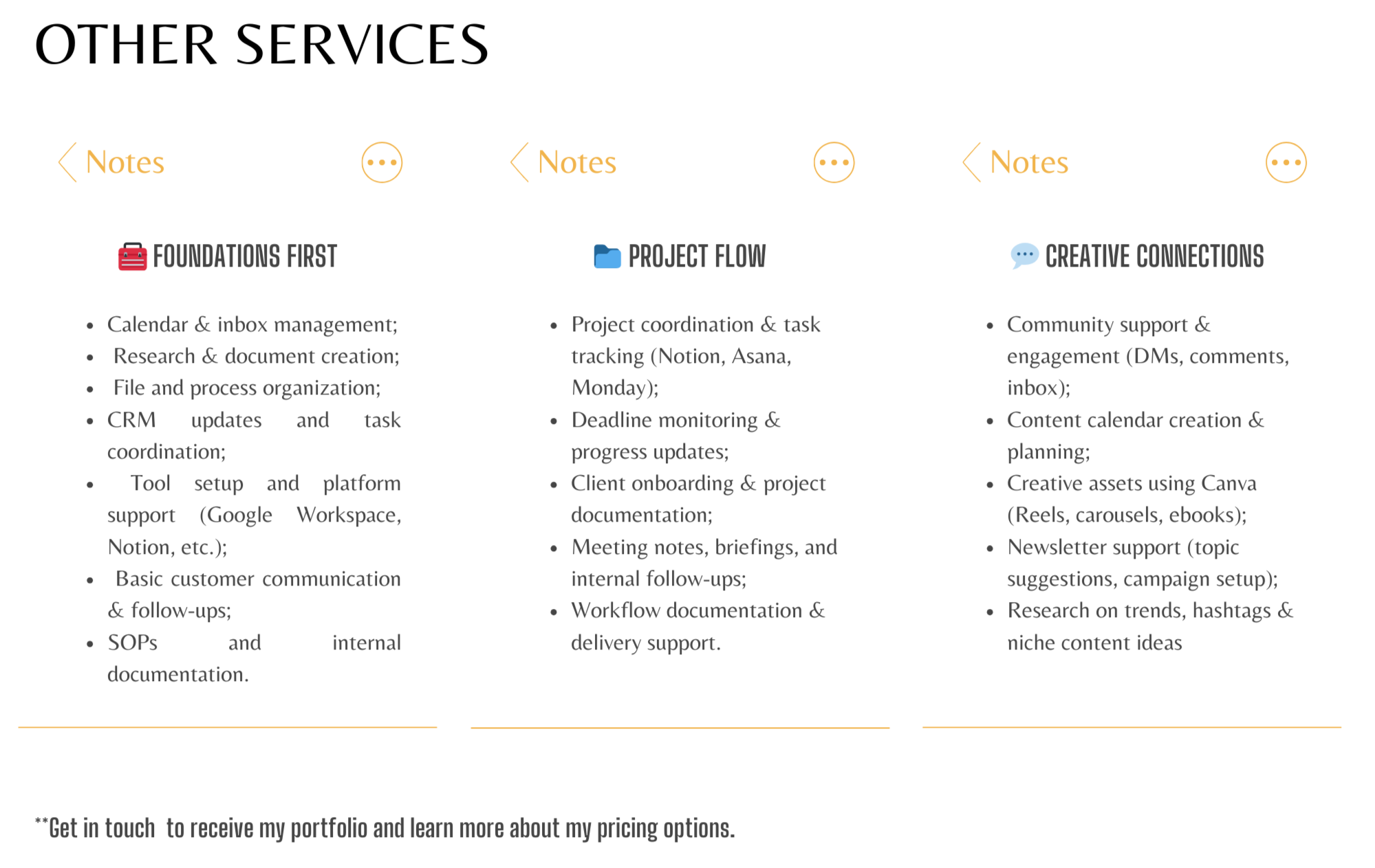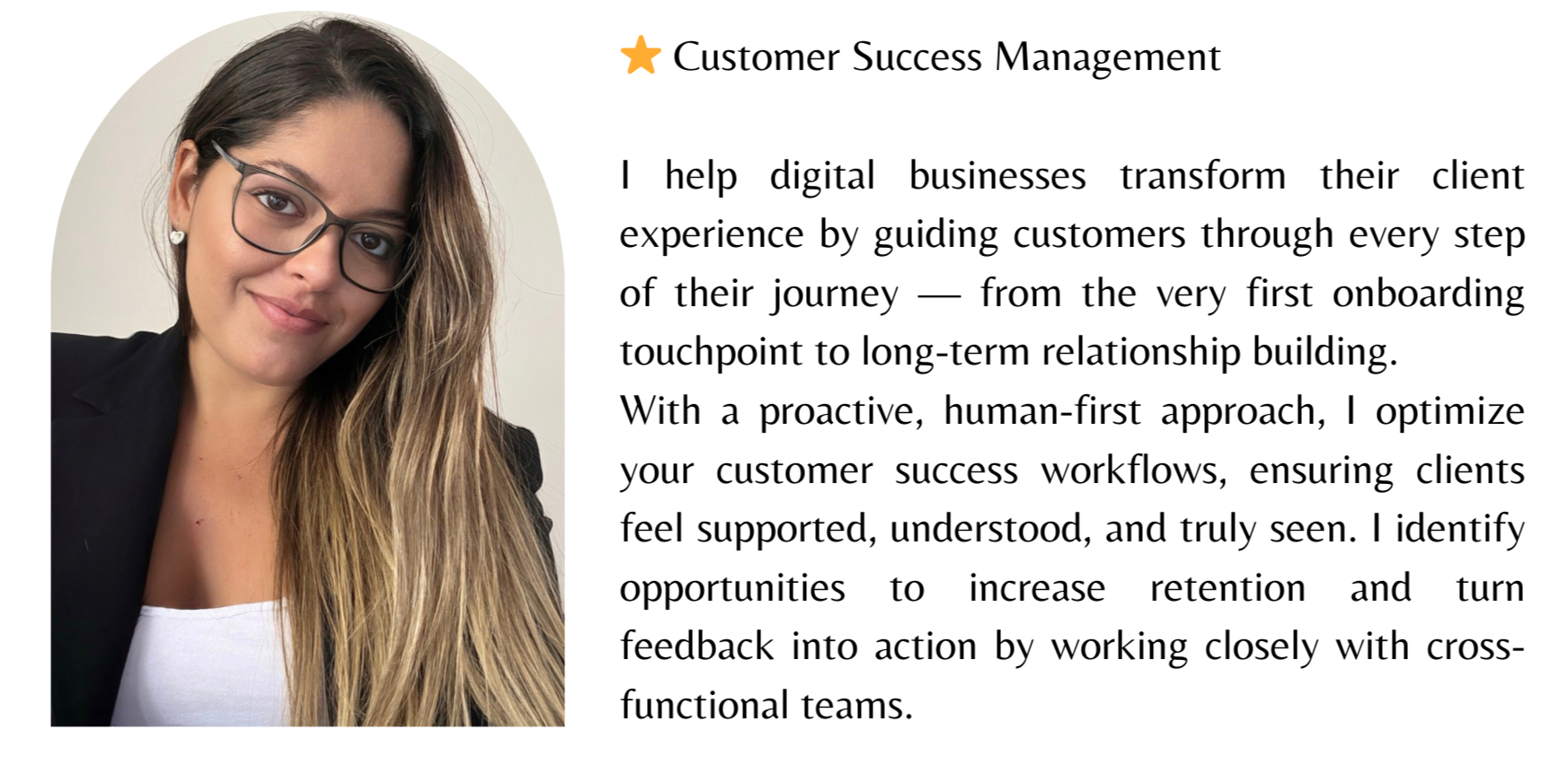 🌿 Hello there, I'm Sara!Looking for someone who can elevate your client experience, streamline operations, and communicate with clarity and care — all while helping your business grow? That’s where I come in!With a solid background in client support, digital operations, and project coordination, I help businesses not only serve — but truly connect with — their clients. Whether it's designing onboarding journeys, managing communities, handling admin tasks, or bringing structure to your projects, I combine efficiency with empathy to deliver results that matter.💫 But here’s the thing — I’m not just here to get things done.